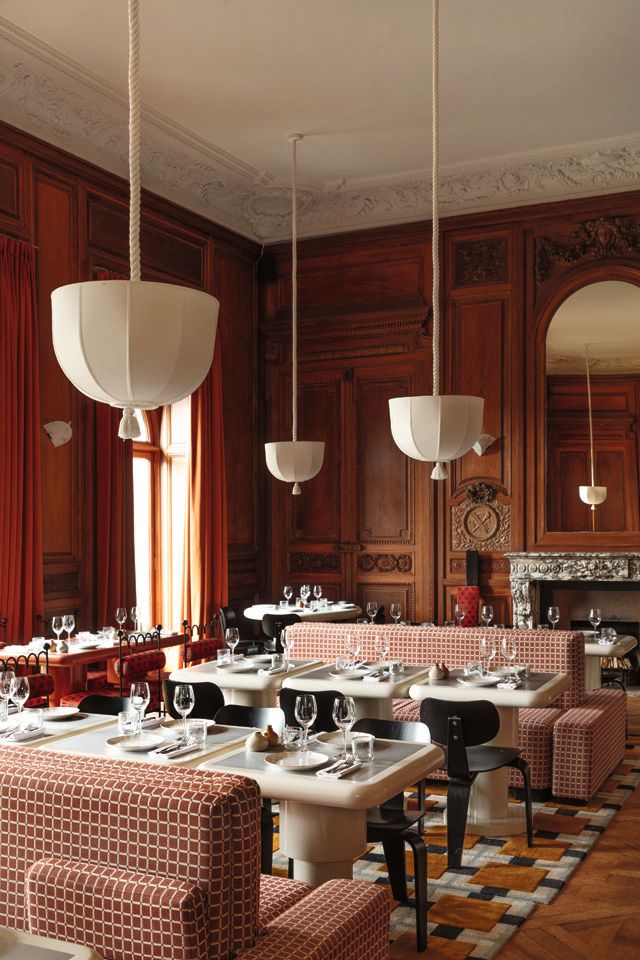 Die geschnitzten Holzvertäfelungen im Restaurant waren früher weiß gekalkt worden. Dorothée Meilichzon ließ diese Farbschicht abtragen und das ursprüngliche dunkle Holzfinish über viele Monate hinweg von französischen Handwerkern wiederherstellen. Die historische Anmutung des Raumes bildet einen wirkungsvollen Kontrast zu den hochglänzenden, abgerundeten Tischen in Weiß im Look der 70er-Jahre sowie zu den schmiedeeisernen Stühlen und Sofas mit Sitz- und Rückenpolstern aus rotem , gemustertem Samt.