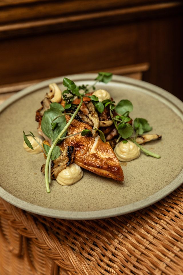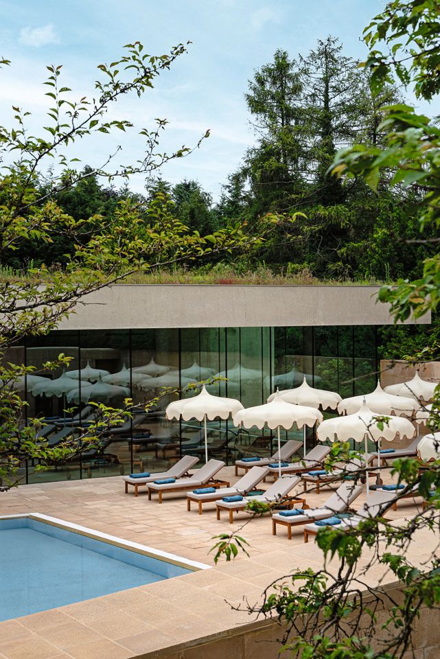 Während die Designerin im übrigen Haus meist auf Blau- und Grüntöne setzt, empfängt der Speisesaal seine Gäste in behaglichen Nuancen von Rot bis Rosa. Die verwendeten Stoffe, Farben und Materialien schaffen eine natürliche Wohlfühlatmosphäre. Für stimmungsvolles Ambiente sorgen tiefhängende Lampen mit Quaste sowie Wandleuchten, die die Holzvertäfelungen in warmes Licht tauchen. Dieser Raum öffnet sich auch zu der großen Terrasse mit Blick auf die üppigen Gärten und den kleinen See. Chefkoch Jackson Boxer setzt auf regionale Highlights mit französischen Akzenten. „Er verkörpert die Quintessenz des englischen Küchenchefs, mit seinem Respekt vor den Zutaten und seiner Verbundenheit mit der Natur“, so Pierre-Charles Cros. „Wir haben gemeinsam eine Speisekarte mit möglichst vielen lokalen Produkten und Erzeugnissen aus dem Garten zusammengestellt, sehr raffiniert und elegant für unsere Gäste“.