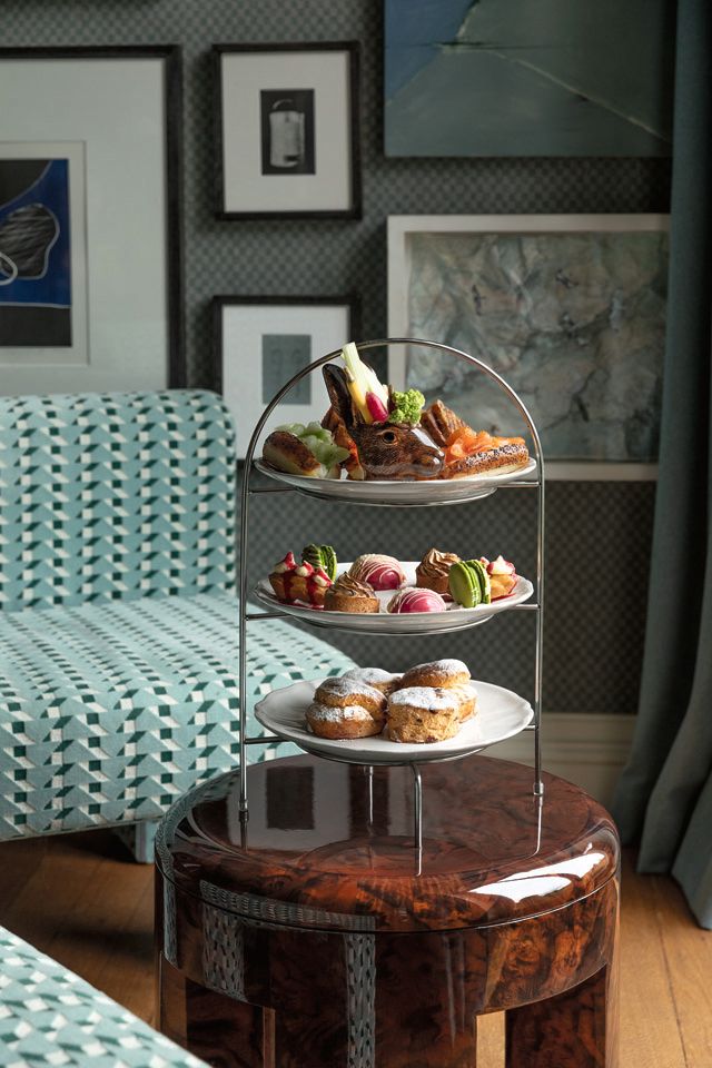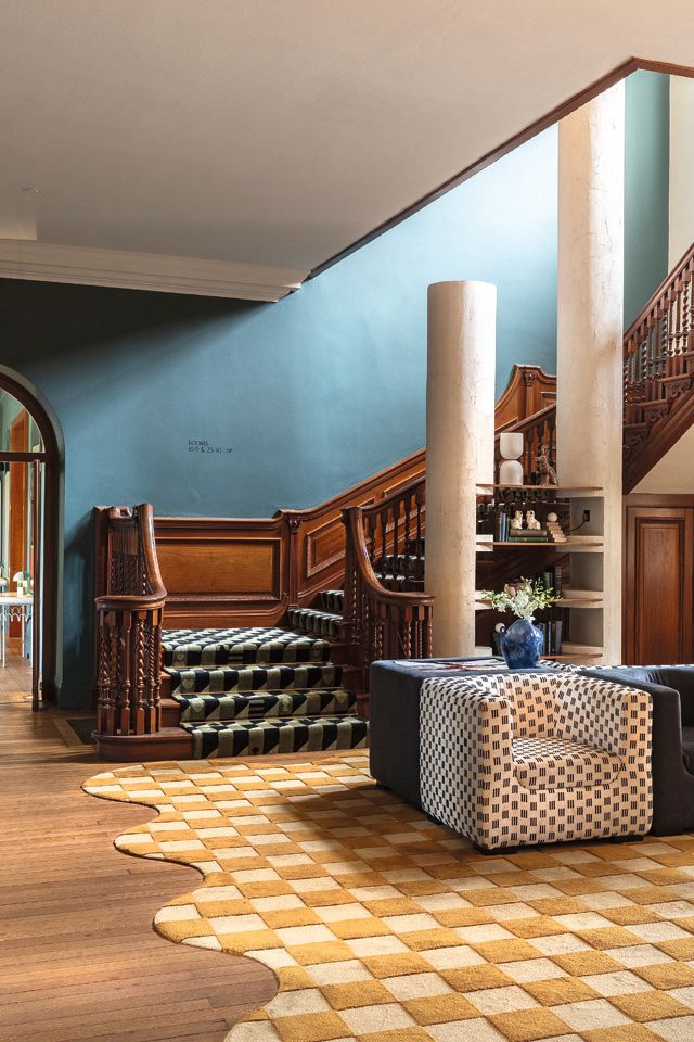Und dazu lieferte das Gebäude selbst die Vorgaben. „Die wunderbare Atmosphäre war schon da“, berichtet Dorothée Meilichzon. „Wir mussten sie nur noch in die Gegenwart holen.“ Mit ihrem feinen Gespür für den Mix unterschiedlicher Epochen und Stile vereint sie die beiden Welten des Klassischen und Zeitgenössischen auf das Schönste. „Wir waren uns einig, dass wir hier nur so wenig wie möglich verändern dürfen“, führt die Designerin weiter aus. So blieb die originale dunkle Holzvertäfelung der Hotellobby ebenso erhalten wie der reich verzierte Treppenaufgang. Einen spannenden Kontrast dazu bilden ein moderner Teppich mit Schachbrettdesign, die tiefblaue Wandfarbe und geometrisch gemusterte Stoffe auf den gepolsterten Clubsesseln.