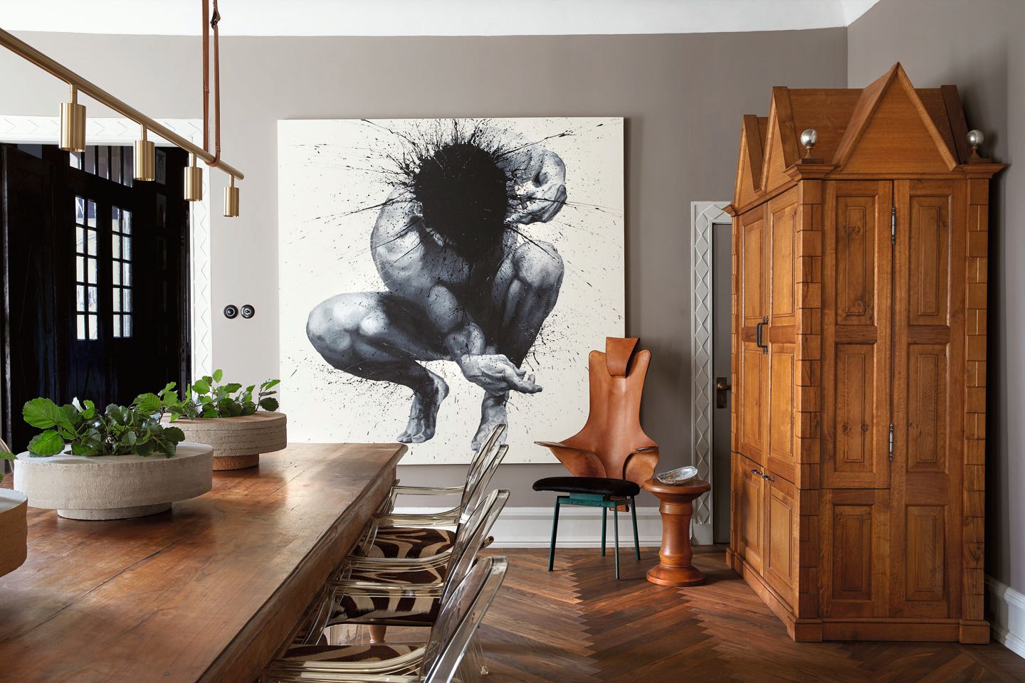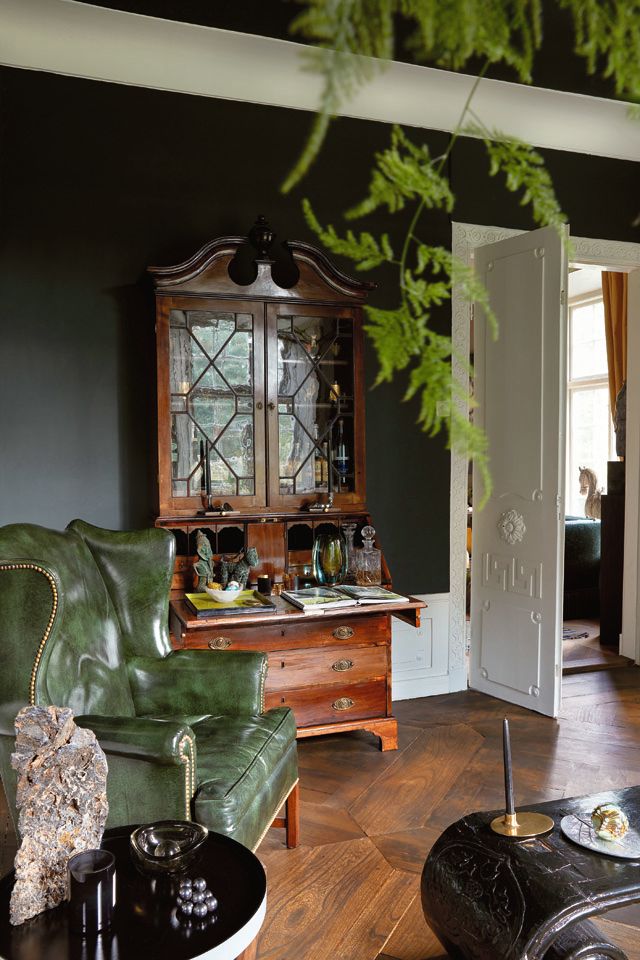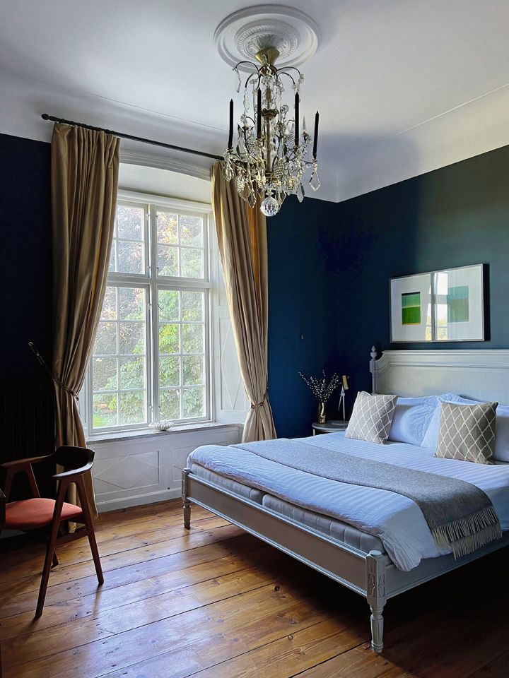 Das Erdgeschoss des U-förmigen Haupthauses besteht aus zwei Küchen und einer Speisekammer, einer Reihe von Salons, je zwei Wohn-und Esszimmern, die sich zum Garten hin öffnen und der „Thott Suite“ – ein kleines Apartment für Selbstverpfleger. Zehn Schlafzimmer samt Bädern, zwei Büros, und ein Weinkeller verteilen sich über weitere Etagen. „Das Haus befand sich in einem schlechten Zustand, als wir es kauften. Glücklicherweise hatte der Vorbesitzer das Dach erneuert, um weitere Schäden zu vermeiden, nachdem der Regen jahrelang vom vierten Stock bis in die zweite Etage tropfte“, sagt Jamie und ergänzt: „Abgesehen vom Einbau sechs einfacher Badezimmer wurden in den letzten Jahrhunderten kaum größere Ausbesserungen vorgenommen.“ Das Positive daran: Der Großteil der ursprünglichen Eichendielen im Fischgrätmuster sowie die exquisiten, teils mit Schnitzereien versehenen Türen, Türrahmen und Innenfensterläden waren erhalten geblieben.