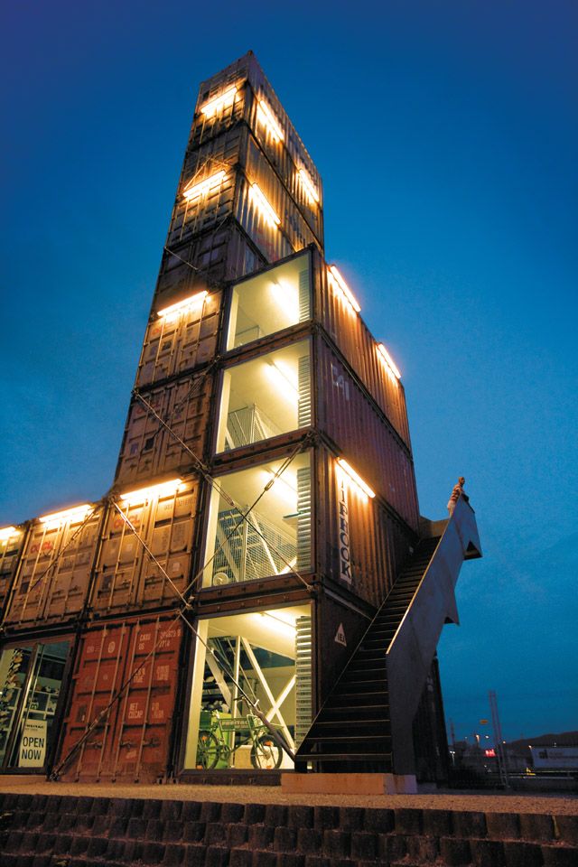Das Viertel Zürich-West, einst Industriegebiet, ist heute ein Spielplatz für Kreative. Und für Turmliebhaber. Dort ragt der Prime Tower empor, ein gläserner Riese mit imposanter Eingangshalle und Rooftop-Bar. 150 Meter weiter steht ein ganz anderer Riese: der Freitag Tower aus gestapelten Frachtcontainern. Das gleichnamige Unternehmen stellt dort auf vier Etagen seine Taschen aus recycelten LKW-Planen aus.