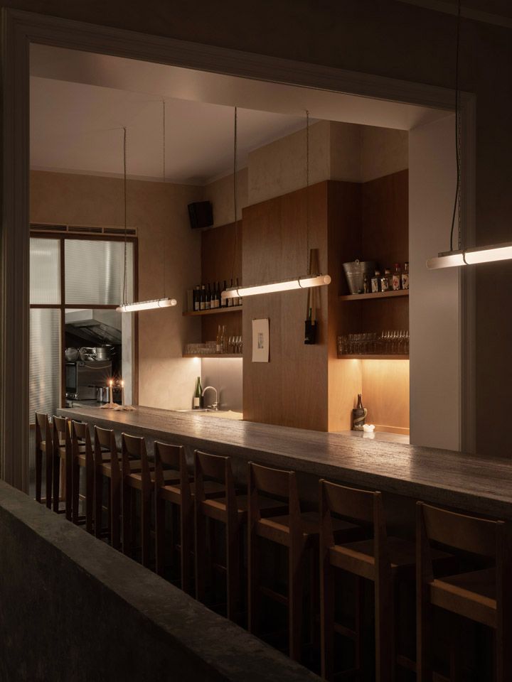 Ein großer zentraler Tresen lädt zum Bleiben ein. Zum Reden. Zum Nachbestellen. Tische aus Travertin, warmes Licht von Barbier Bouvet, Stühle von FRAMA. Das Interieur, gemeinsam mit Architektin Nelly Smets entwickelt, wurde 2023 gleich doppelt ausgezeichnet.