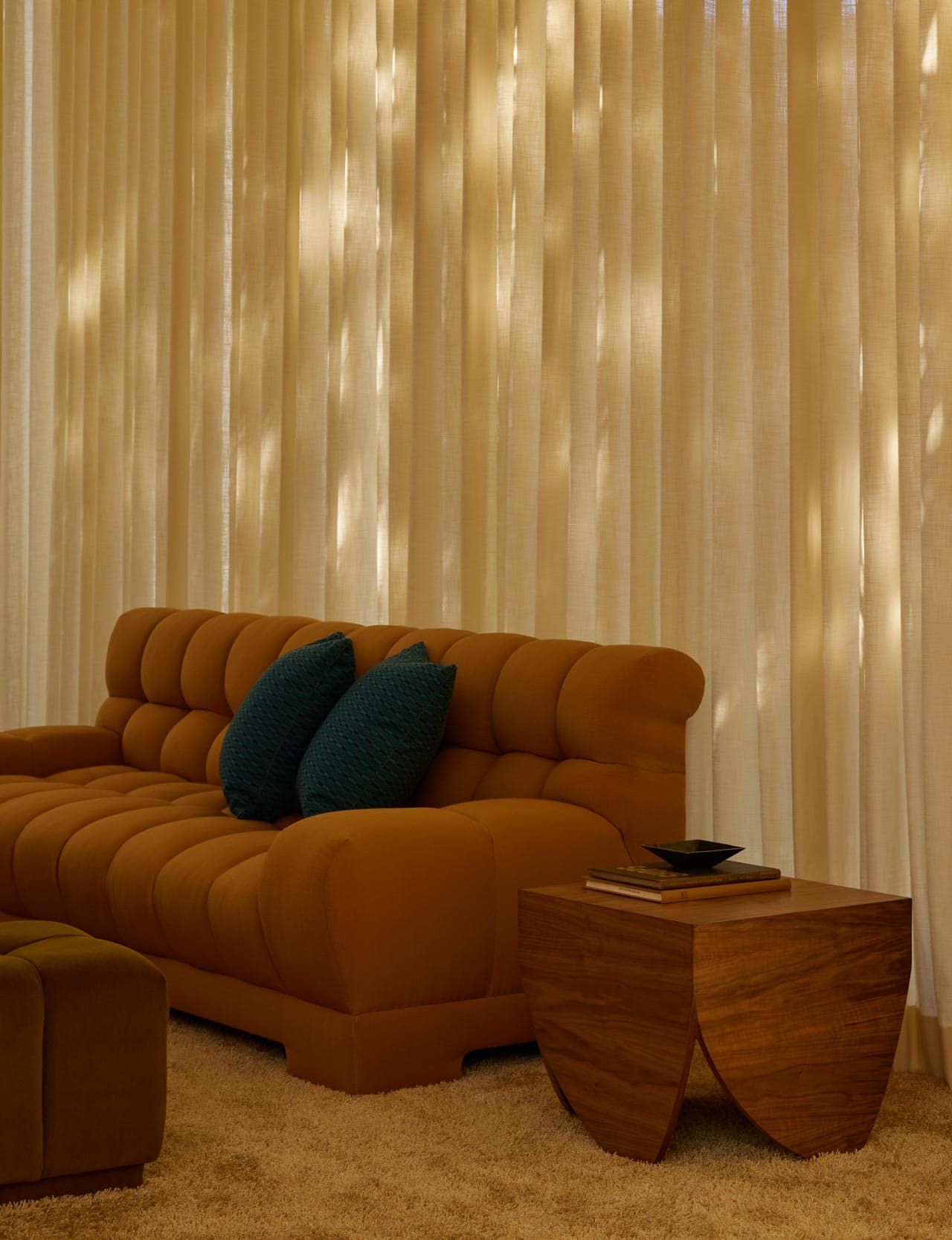 Jedes Stück von glatten Tischen aus Holz bis zu weichen Sesseln trägt subtile Anspielung auf Vergangenes : An das Sofa der Großmutter, an Reisen, an Kaliforniens massive Eichen. Farblich zeigt sich die Kollektion nuanciert: Rojo Alicante Marmor mit Leder-Finish trifft auf individuell pigmentierte Hölzer, ausgewählt mit Blick auf Zeitlosigkeit und Haptik.