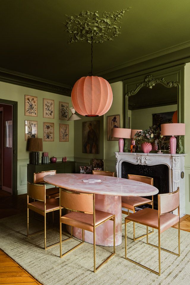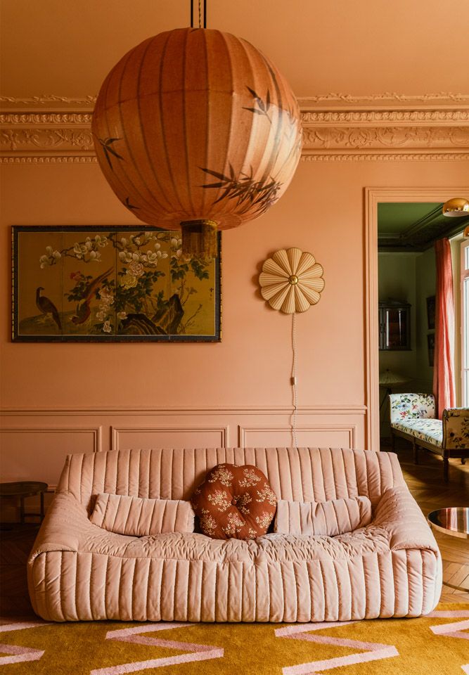 Doch das Ergebnis überzeugte auch sie. Heute leuchten die Räume in kräftigem Lachsrosa, hellem Gelb und sattem Grün. Ein Mix, der ebenso mutig wie harmonisch wirkt und ihre Designphilosophie widerspiegelt. „Für mich sind Farben elementar. Das beste Mittel, Emotionen und Gefühle auszudrücken“, erklärt sie. „So entstehen einzigartige und authentische Umgebungen.“ Nirgendwo wird das deutlicher als in ihrem Lieblingsraum, dem Wohnzimmer. Er strahlt Wärme und Gemütlichkeit aus und wirkt wie ein perfektes Spiegelbild von Tiphaines Persönlichkeit: verspielt, feminin und ein wenig nostalgisch.
