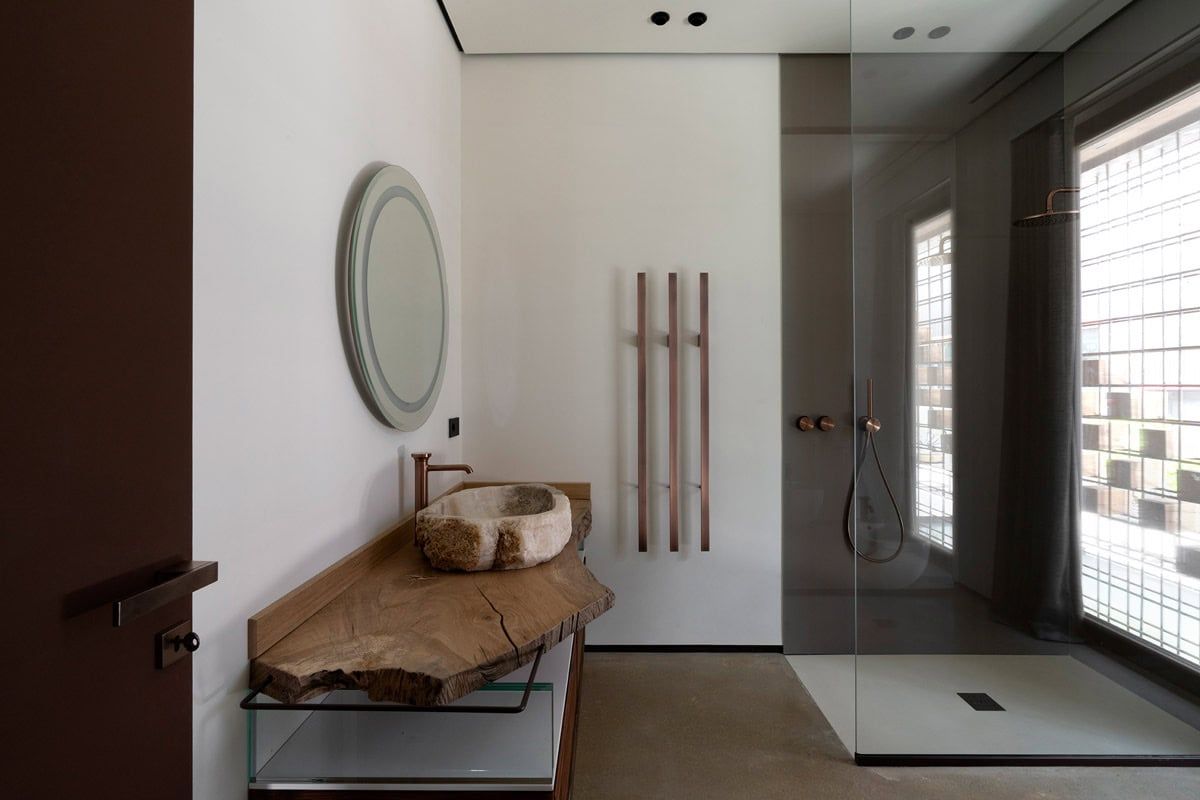 Gerade weil es so schwer ist, designstarke Wärmekörper zu finden, wird I Ching zum Statement. Er wärmt nicht nur, er schmückt. In der Ausführung Matt Brushed Copper verschmilzt er mit den Armaturen, verleiht dem Bad Tiefe und einen Hauch von Luxus. Dank seiner extra-niedrigen Spannung (24 Volt) bleibt er dabei sicher – selbst in der Dusche.